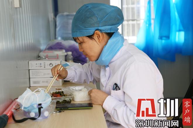 晏醫(yī)生在臨時休息室內(nèi)吃盒飯。