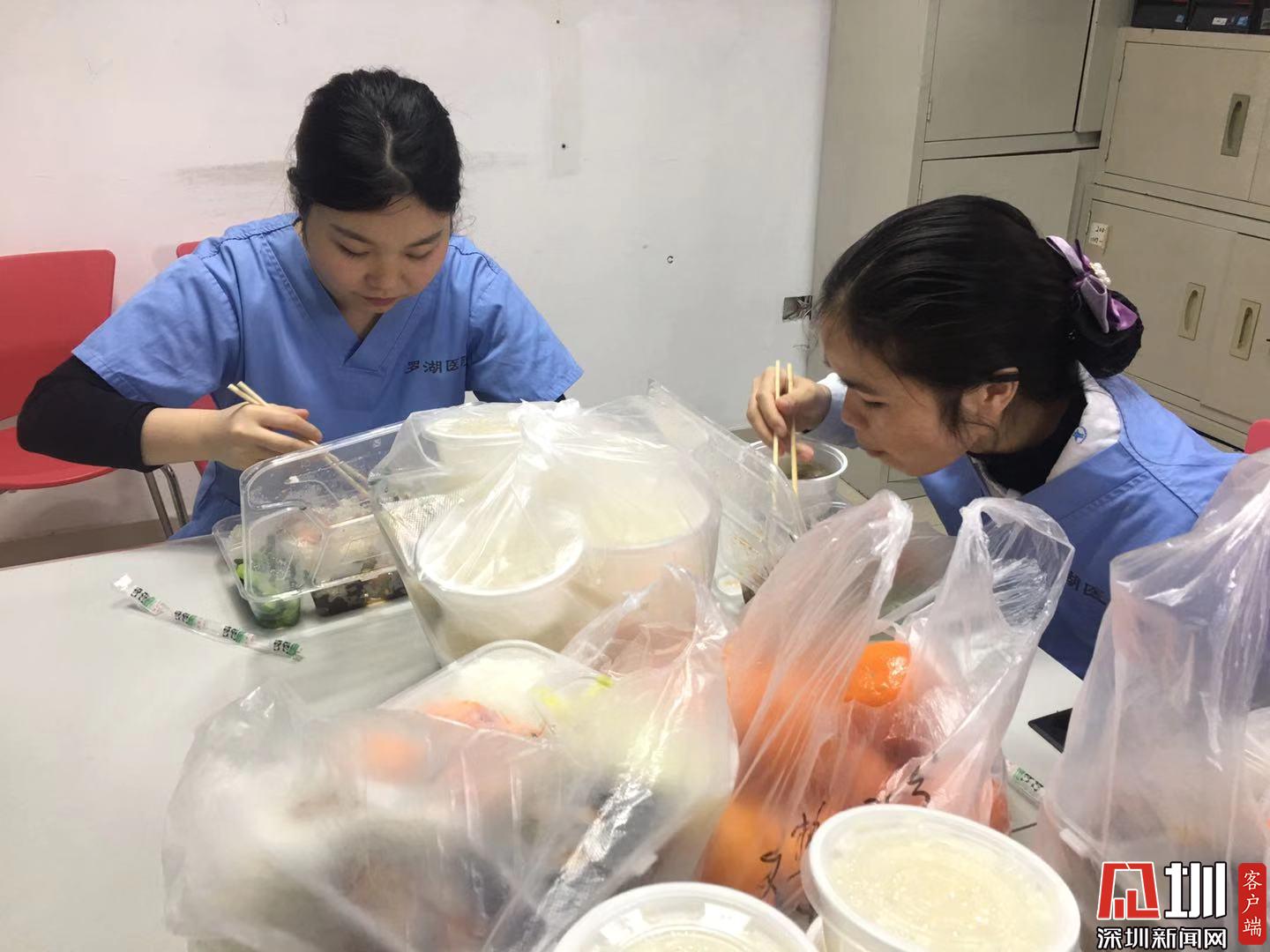 2020年2月6日,正在用午餐的羅湖區(qū)人民醫(yī)院發(fā)熱門診醫(yī)護人員。因為新型冠狀病毒感染的肺炎疫情形勢嚴峻,醫(yī)護人員由以往的到食堂吃飯,改為現(xiàn)在將飯統(tǒng)一領(lǐng)回到辦公區(qū),大家到辦公室分餐吃。為避免集中用餐,改為分批輪流吃飯。(見圳客戶端、深圳新聞網(wǎng)記者彭桂紅)