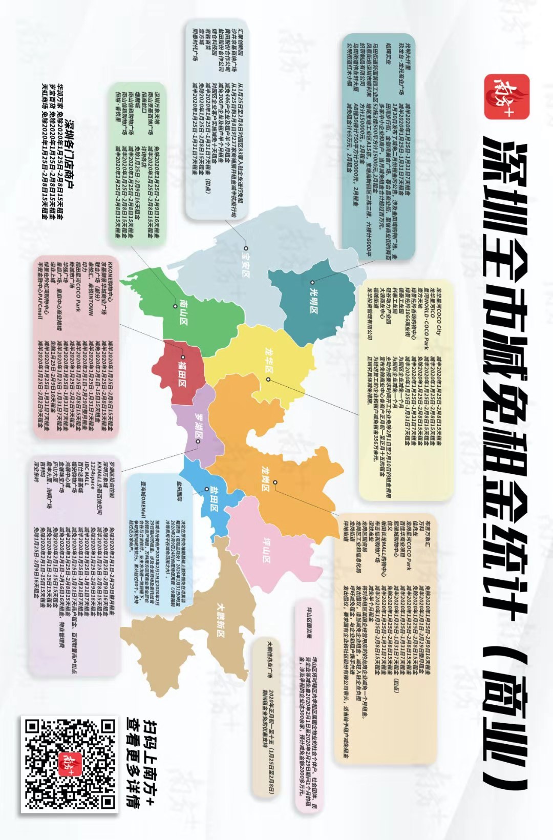 3、鹽田區(qū):對符合條件的商戶減免2、3兩月租金。此次免租政策涉及近40萬平方米經(jīng)營性物業(yè),惠及租戶230余家,減免租金2000多萬元。