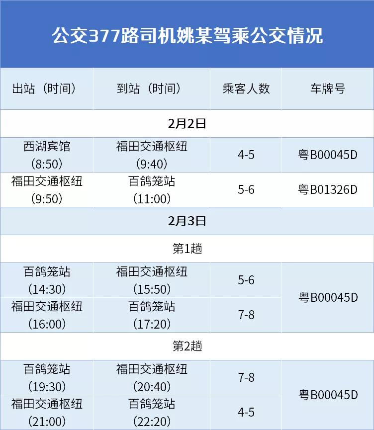 2月2日上午,姚某到車(chē)隊(duì)報(bào)到,按照公司疫情防控工作規(guī)定,經(jīng)體溫檢測(cè)正常后,車(chē)隊(duì)安排姚某隨377路跟班一趟(先后搭乘2臺(tái)車(chē),分別是粵B00045D、8時(shí)50-9時(shí)40分、粵B01326D、9時(shí)50-11時(shí))共約2小時(shí),期間先后同車(chē)乘坐乘客11名。車(chē)載視頻顯示,姚某多數(shù)時(shí)間坐在公交車(chē)中后部,并佩戴口罩。