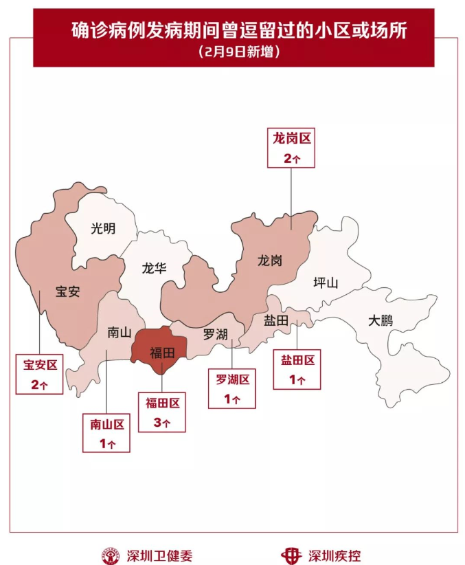 2月9日,疾控專業(yè)人員通過最新的流行病學調(diào)查確認,深圳新增10個小區(qū)(場所),有新確診的病人在出現(xiàn)病征期間曾經(jīng)逗留。
