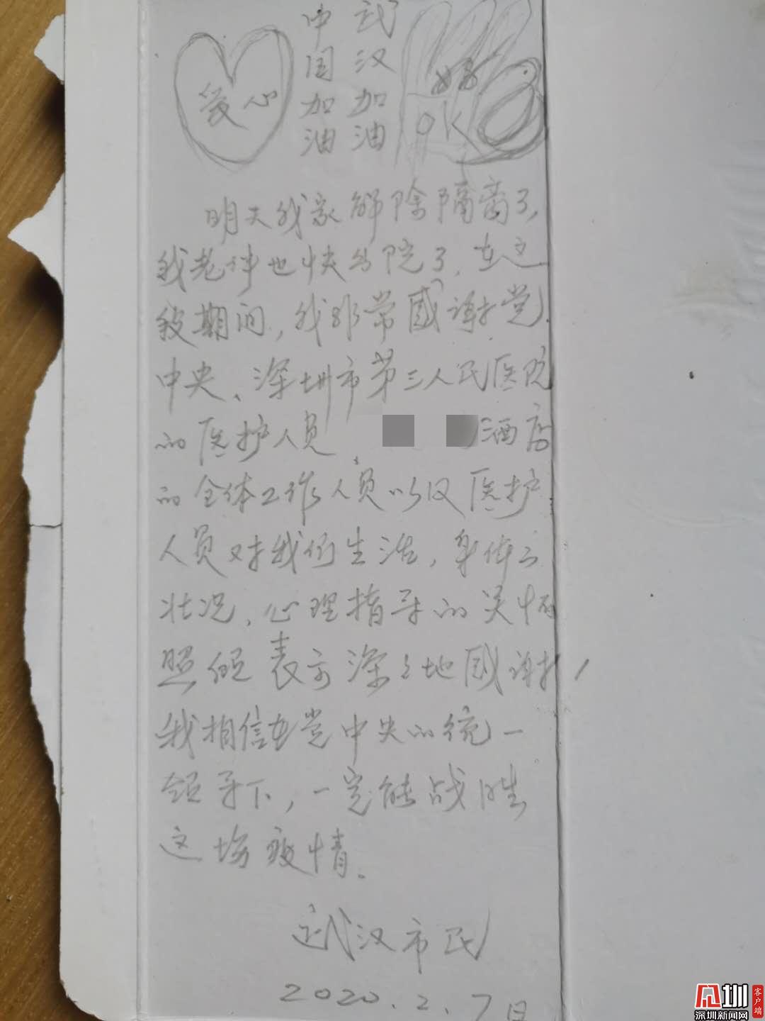 2月7日,一位來(lái)深的武漢市民在離開(kāi)桃源定點(diǎn)隔離酒店前,匆忙中不忘撕下一片紙巾盒,用酒店的鉛筆留下一張暖心紙條,對(duì)陪他度過(guò)14天隔離期的工作人員表達(dá)由衷的感激,對(duì)全民抗“疫”的前景表示必勝的信心。