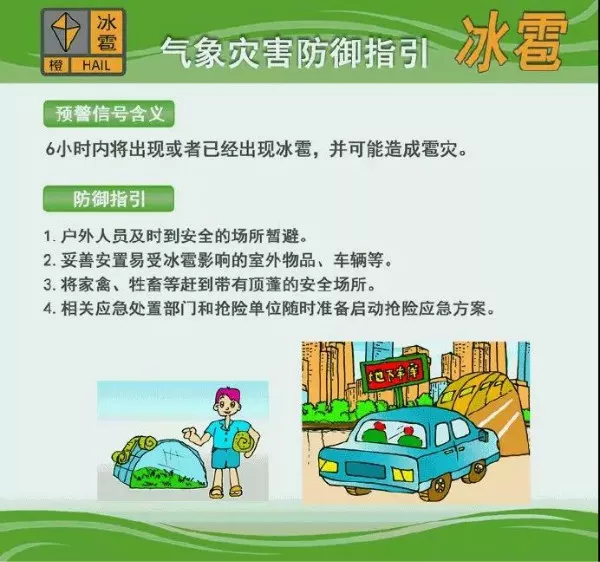 冰雹橙色預警信號表示6小時內(nèi)將出現(xiàn)或者已經(jīng)出現(xiàn)冰雹,并可能造成雹災。
