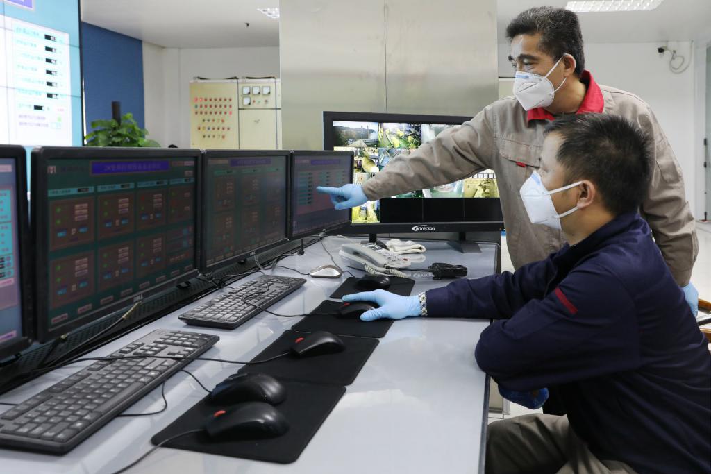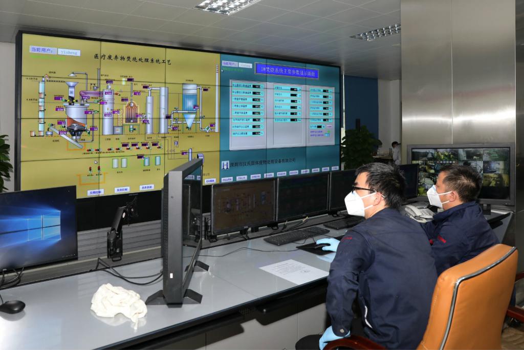 ▲工作人員通過實(shí)時(shí)影像監(jiān)測(cè)醫(yī)療廢物處置過程。