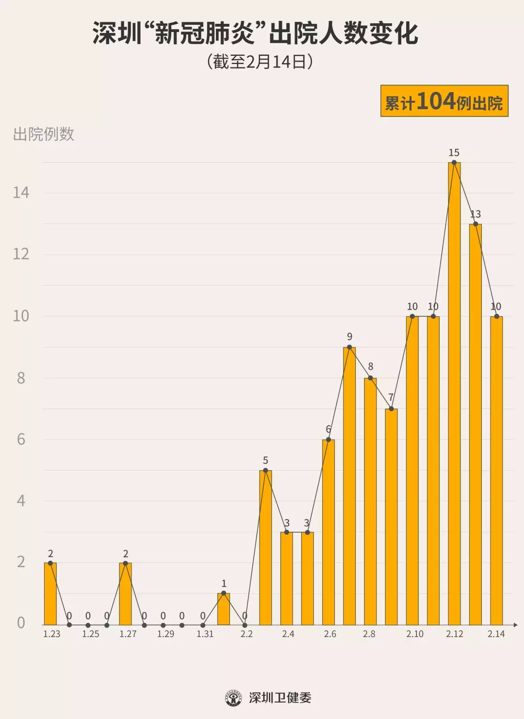 2月14日下午,經(jīng)專家組會(huì)診,深圳再有10名新型冠狀病毒肺炎確診患者出院,累計(jì)達(dá)104人。