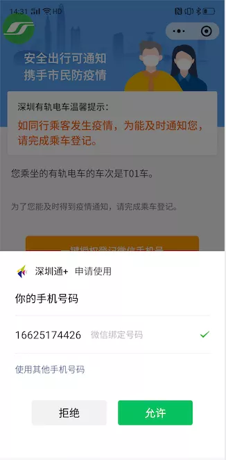 第一步:乘客使用微信掃描列車車廂內(nèi)的登記碼,登記頁面會自動顯示上次登記的手機號或在“深圳通+”小程序中注冊的手機號碼: