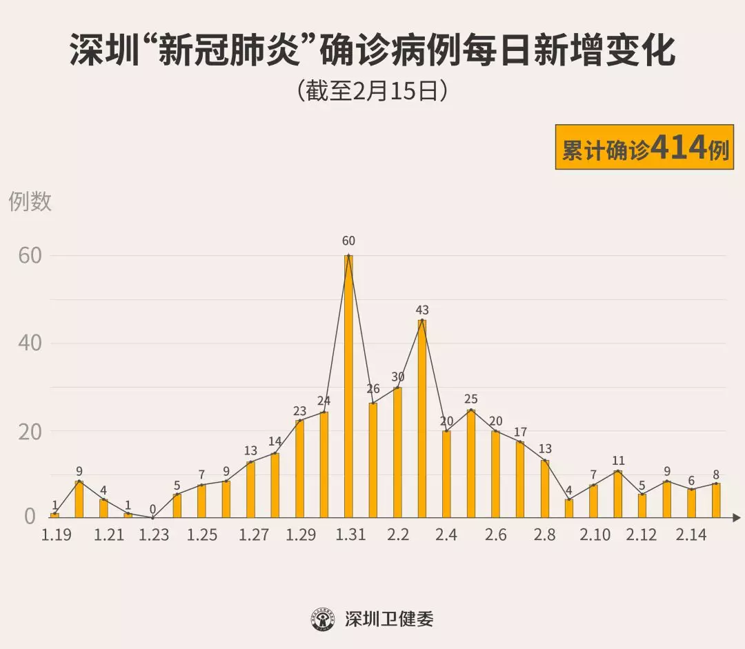 截至2月15日24時(shí),深圳累計(jì)報(bào)告“新冠肺炎”確診病例414例。2月15日當(dāng)天全市新增確診病例8例(個(gè)案詳情今晚公布)。 ▲新增出院病例已超過(guò)新增確診病例 累計(jì)報(bào)告確診病例中,男性195例、女性219例。 按照病例管理地區(qū)劃分,南山區(qū)87例、福田區(qū)78例、龍崗區(qū)71例、寶安區(qū)62例、龍華區(qū)34例、羅湖區(qū)32例、光明區(qū)11例、坪山區(qū)7例、鹽田區(qū)6例、大鵬新區(qū)2例、其他(指由機(jī)場(chǎng)、車(chē)站、碼頭、關(guān)口、路卡等直接送往定點(diǎn)醫(yī)院的)24例。 目前,重癥29例、危重癥9例,無(wú)死亡病例,累計(jì)出院115例。 299例確診病例均在深圳市第三人民醫(yī)院隔離治療。 541例密切接觸者正在接受醫(yī)學(xué)觀察。 資料來(lái)源:深圳市疾控中心、深圳市衛(wèi)健委、廣東省衛(wèi)健委