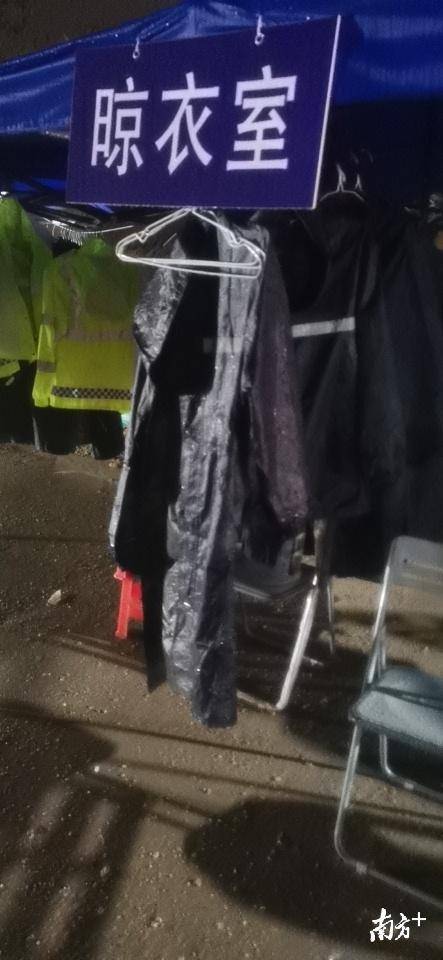 大雨滂沱,工作人員鞋子幾乎濕透。