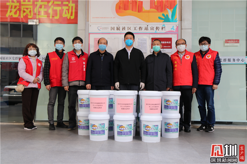 深圳市人大代表、廣東吉明玻璃工程有限公司總經(jīng)理吳冰向國展社區(qū)工作站熱心捐贈(zèng)消毒液等物資。