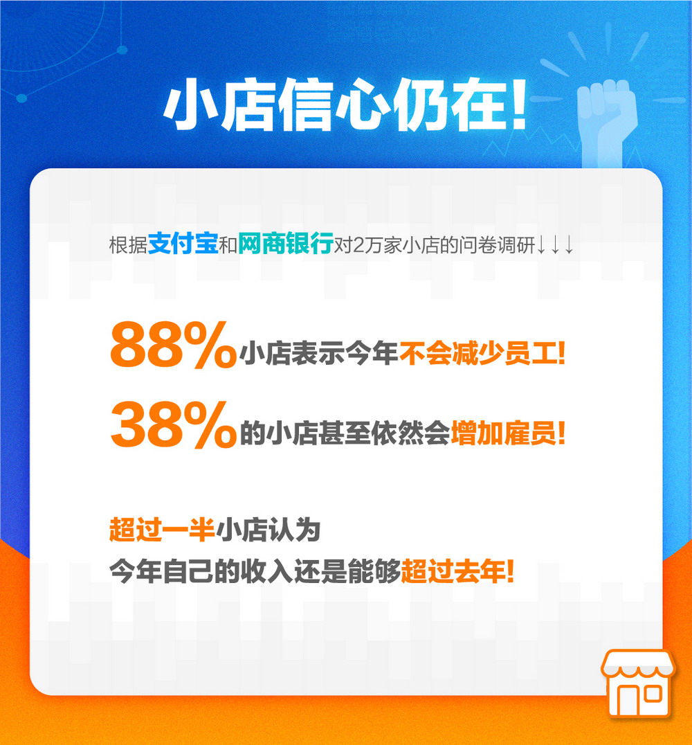 根據(jù)支付寶和網(wǎng)商銀行對(duì)20000家小店的問卷調(diào)研,88%小店表示,今年不會(huì)減少員工,38%的小店表示,依然會(huì)增加雇員;超過一半小店認(rèn)為今年自己的收入還是能夠超過去年。