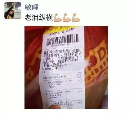 1月30日晚上8點(diǎn)56分,華中科技大學(xué)協(xié)和深圳醫(yī)院(南山醫(yī)院)手外科護(hù)士王敏在朋友圈曬了一張照片,照片里是一個(gè)紅色塑料袋上貼著一張外賣(mài)單,備注上寫(xiě)著,“南山醫(yī)院發(fā)熱門(mén)診的醫(yī)務(wù)工作者們,你們辛苦了!請(qǐng)收下一個(gè)普通市民的一點(diǎn)點(diǎn)心意,加油,肺炎必?cái)?!?/p>