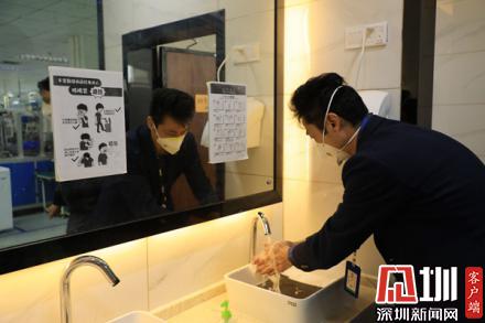 個人衛(wèi)生防護方面,餐廳洗手池、衛(wèi)生間都擺放了消毒洗手液,并張貼著“洗手七步標(biāo)準(zhǔn)法”,指導(dǎo)員工正確洗手。