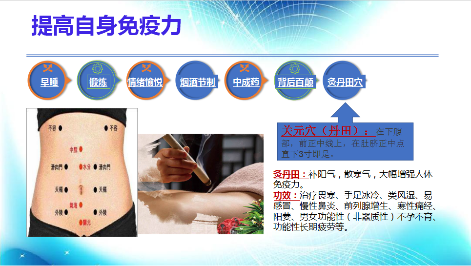 7.灸丹田穴:丹田在下腹部,前正中線上,在肚臍正中點直下3寸即是。灸丹田穴可以補陽氣,散寒氣,大幅增強人體免疫力。