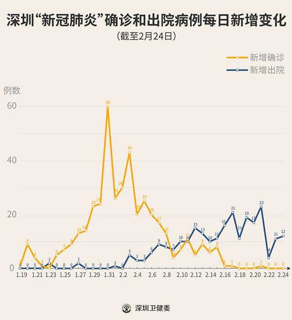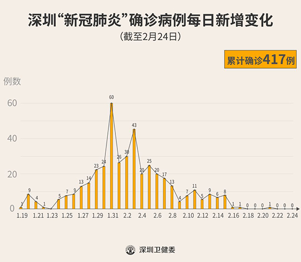 截至2月24日24時,深圳累計報告“新冠肺炎”確診病例417例。2月24日當天全市無新增確診病例。