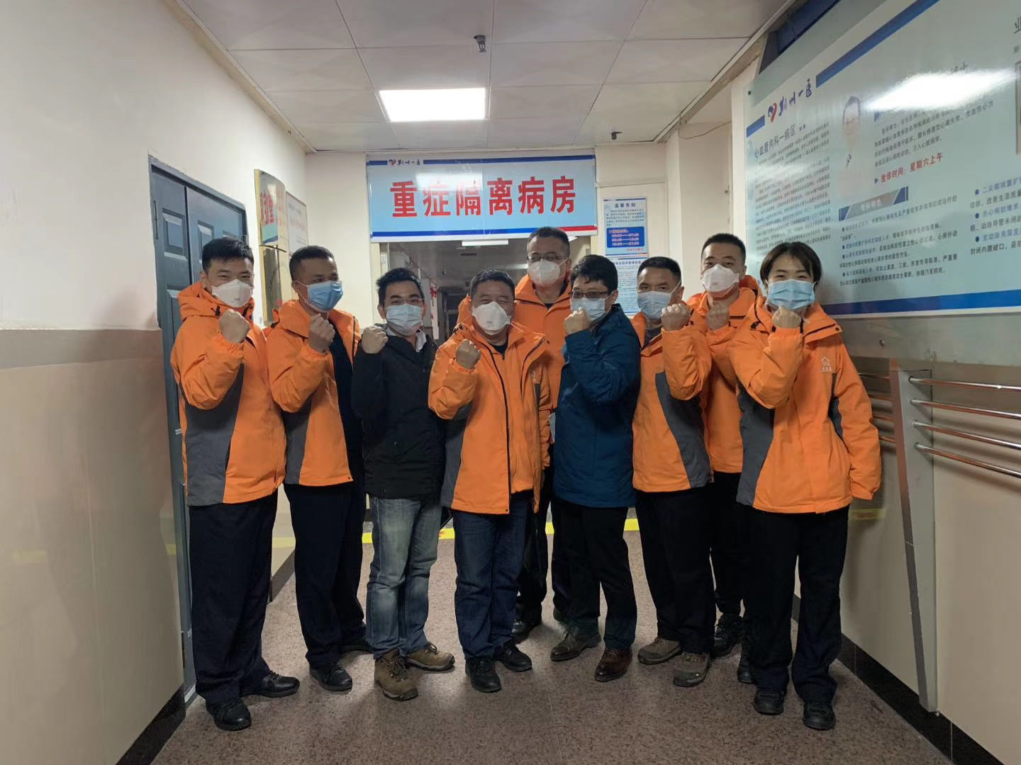 醫(yī)生團(tuán)隊(duì)共有7個(gè)人,我也將他們送到重癥隔離病區(qū)門(mén)口。我不能進(jìn)去,就和大家一起合了個(gè)影,這是我這一輩子都不能忘記的一次合影,我們每個(gè)人豎拳的手勢(shì)都那么有力,每個(gè)人的眼神都那么堅(jiān)定!連最瘦弱的女醫(yī)生單雪也看起來(lái)充滿力量。