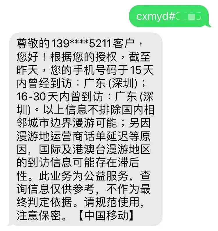 編寫CXMYD,發(fā)送到10086,再依據(jù)回復短信輸入身份證后四位可查詢過去一個月內(nèi)去過的省和直轄市(無地市)。每人免費一天查詢10次