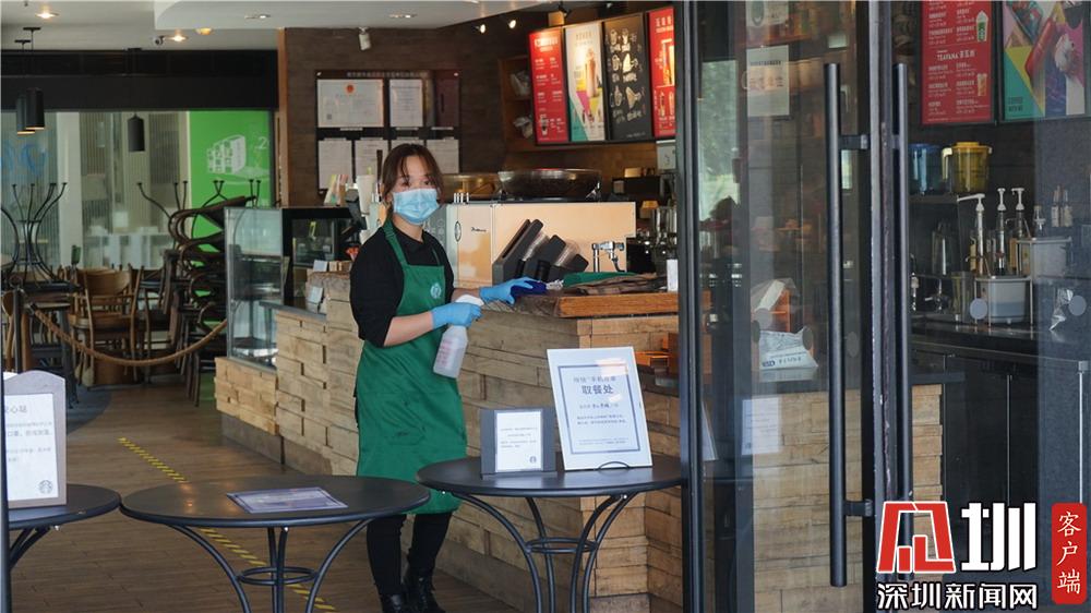 咖啡館都采用門口取餐帶走的銷售模式,圖為正在進(jìn)行消毒情節(jié)的員工。