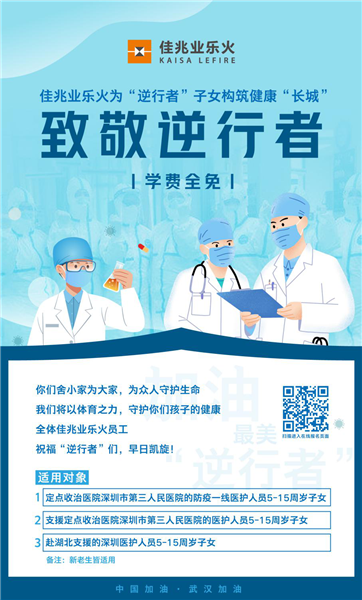 佳兆業(yè)文體集團旗下的佳兆業(yè)樂火國際文體學校將于3月1日到12月31日為深圳抗疫醫(yī)護人員子女送免費培訓課程。