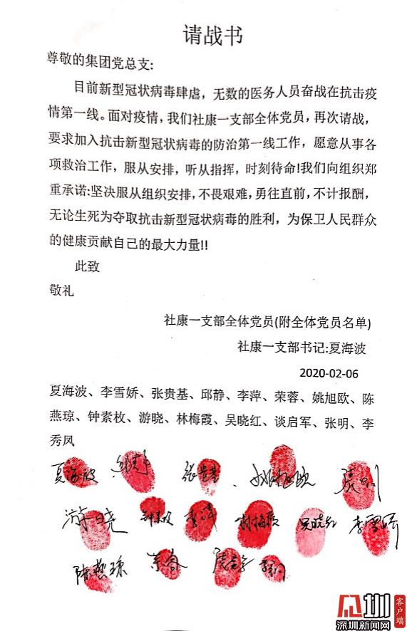 見圳客戶端·深圳新聞網(wǎng)訊(記者 董非)“讓黨旗在防控斗爭第一線高高飄揚(yáng)?!毙鹿诜窝滓咔榘l(fā)生以來,南山區(qū)醫(yī)療集團(tuán)總部黨員勇當(dāng)先鋒,以實(shí)際行動(dòng)踐行初心使命,涌現(xiàn)出眾多感人故事,展現(xiàn)了共產(chǎn)黨員的風(fēng)采與擔(dān)當(dāng)。 疫情發(fā)生后,南山區(qū)第一時(shí)間制定出臺(tái)了《黨建引領(lǐng)疫情防控工作五項(xiàng)行動(dòng)方案》,南山區(qū)委書記王強(qiáng)號(hào)召全體黨員,發(fā)揮黨組織的戰(zhàn)斗堡壘作用和黨員的先鋒模范作用,全力保障人民群眾生命安全和身體健康,讓黨旗在防控疫情斗爭第一線高高飄揚(yáng),堅(jiān)決打贏疫情防控人民戰(zhàn)爭、總體戰(zhàn)、阻擊戰(zhàn)。南山區(qū)醫(yī)療集團(tuán)總部積極響應(yīng),黨建引領(lǐng)下的防控抗疫工作有序科學(xué)地展開。 今年1月底,深圳市南山區(qū)區(qū)委授旗成立南山醫(yī)療系統(tǒng)黨員突擊隊(duì)。南山區(qū)醫(yī)療集團(tuán)總部緊急組建了防控新冠肺炎應(yīng)急突擊隊(duì),僅一天內(nèi)區(qū)醫(yī)療集團(tuán)就共有169人完成第一批應(yīng)急突擊隊(duì)報(bào)名,其中黨員過半數(shù)。 疾風(fēng)知?jiǎng)挪荩一馃捳娼?。一封封?qǐng)戰(zhàn)書閃電匯聚到黨總支,召即來,來能戰(zhàn),戰(zhàn)能勝,沖鋒在前就是擔(dān)當(dāng)?shù)淖蠲姥堇[;一位位黨員迅速入隊(duì)黨員突擊隊(duì),他們重溫入黨誓言,在黨旗下實(shí)踐著醫(yī)者仁心、人間大愛;一份份入黨申請(qǐng)書紛沓而來,特殊時(shí)期經(jīng)受特殊考驗(yàn),一批優(yōu)秀的醫(yī)護(hù)人員頁主動(dòng)向黨組織靠攏。鏗鏘的語言、堅(jiān)定的決心、舍我的擔(dān)當(dāng),是南山區(qū)醫(yī)療集團(tuán)總部廣大黨員逆行而上、抗擊疫情的堅(jiān)定決心和必勝信心。 最美逆行黨支部,積極請(qǐng)戰(zhàn)敢擔(dān)當(dāng) “我是共產(chǎn)黨員,我請(qǐng)戰(zhàn)!愿為戰(zhàn)勝疫情全力以赴!”這是南山區(qū)醫(yī)療集團(tuán)總部一支部13名黨員和2名入黨積極分子聯(lián)名撰寫的《請(qǐng)戰(zhàn)書》(節(jié)選)。 面對(duì)新冠肺炎疫情,一支部黨員在夏海波支部書記夏海波的帶領(lǐng)下,在發(fā)熱門診、發(fā)熱患者預(yù)檢分診、社區(qū)“三位一體”排查等工作中,積極發(fā)揮共產(chǎn)黨員戰(zhàn)斗在一線、沖鋒在一線的模范帶頭作用,為戰(zhàn)勝新冠肺炎疫情全體黨員積極主動(dòng)請(qǐng)戰(zhàn),并向集團(tuán)黨總支遞交了請(qǐng)戰(zhàn)書。 社康一支部全體黨員的請(qǐng)戰(zhàn)書 一個(gè)個(gè)紅手印,令人淚目,彰顯著南山區(qū)醫(yī)療集團(tuán)總部白衣天使們逆行而上的使命擔(dān)當(dāng)和責(zé)任意識(shí)。 一支部書記夏海波說,“成為疫情防控工作第一線發(fā)展黨員,是面對(duì)疫情充分發(fā)揮黨員先鋒作用的具體實(shí)踐。此次請(qǐng)戰(zhàn),將更加激勵(lì)他們我們?cè)诮窈蟮墓ぷ魈貏e是近期防疫防控工作中,以黨員的標(biāo)準(zhǔn)嚴(yán)格要求自己,發(fā)揮黨員先鋒模范作用。同時(shí),也會(huì)對(duì)全院全體員工產(chǎn)生積極引領(lǐng)、鼓舞作用,以更飽滿的斗志投入防疫防控工作。” 老黨員重溫入黨誓詞,面對(duì)黨旗表決心 “我宣誓:我志愿加入中國共產(chǎn)黨……”這是一次特別的宣誓。接到組織號(hào)召后,社康二支部的老黨員鐘達(dá)宏和吳麗娉,對(duì)著黨旗,以重溫入黨誓詞的方式,不忘黨員初心,牢記使命,積極沖鋒在前,誓要打贏防控狙擊戰(zhàn)。 社康二支部的老黨員鐘達(dá)宏和吳麗娉,對(duì)著黨旗,重溫入黨誓詞,誓要打贏防控狙擊戰(zhàn) 面對(duì)來勢(shì)洶洶的疫情,南山區(qū)醫(yī)療集團(tuán)總部的黨組織和黨員干部不但沒有被嚇倒,反而激起了他們昂揚(yáng)的戰(zhàn)斗意志和飽滿的工作熱情。 “我宣誓,我自愿加入抗擊新型冠狀病毒肺炎疫情防控工作隊(duì)伍,責(zé)任上肩,聽黨指揮,服從命令,科學(xué)應(yīng)對(duì),恪盡職守,努力守護(hù)轄區(qū)居民健康,堅(jiān)決打贏疫情防控攻堅(jiān)戰(zhàn)!”守土有責(zé)、守土擔(dān)責(zé)、守土盡責(zé),所有社康中心的黨員干部將筑牢抗疫的基層防線,誓要守護(hù)轄區(qū)居民的生命健康。 社康二支部黨員在黨旗下宣誓努力守護(hù)轄區(qū)居民健康 艱難時(shí)刻主動(dòng)請(qǐng)戰(zhàn),夫妻雙雙奮戰(zhàn)一線 1月26日,南山區(qū)醫(yī)療集團(tuán)總部下發(fā)關(guān)于組建防控新型冠狀病毒感染肺炎應(yīng)急突擊隊(duì)報(bào)名的通知。除了得到集團(tuán)黨員們的積極響應(yīng)之外,各個(gè)支部涌現(xiàn)出一波遞交入黨申請(qǐng)書的小高潮。 李婧是社康支部的一名全科醫(yī)生,一直在社康醫(yī)院中心從事全科醫(yī)療工作,戰(zhàn)“疫”的號(hào)角吹響,李婧第一時(shí)間參戰(zhàn),在所有抗疫時(shí)期入黨人員里第一個(gè)遞交了手寫入黨申請(qǐng)書。 李婧醫(yī)生的手寫入黨申請(qǐng)書 起初,她所在的蔚藍(lán)海岸社康中心考慮到李婧的愛人是深圳市公立醫(yī)院急診科醫(yī)生其愛人是深圳市某公立醫(yī)院的急診科醫(yī)生,疫情發(fā)生以來一直堅(jiān)守在崗位上,家中尚有1歲零3個(gè)月的寶寶,就沒有讓她參加社區(qū)“三位一體”排查和酒店留守值班等一線工