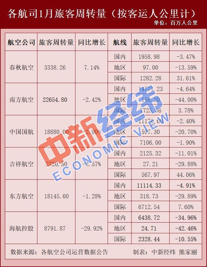 統(tǒng)計發(fā)現(xiàn),春秋航空、南方航空、吉祥航空等6家航空公司已公布2020年1月運營數(shù)據(jù)。從旅客周轉量 (按客運人公里計 )來看,與去年同期相比,1月僅春秋航空一家上漲,增7.14%,其余5家均同比下降。