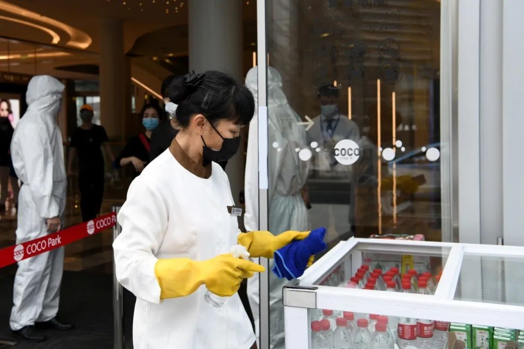 2月29日,商場保潔人員對(duì)“無人冰柜”進(jìn)行清潔和消毒。
