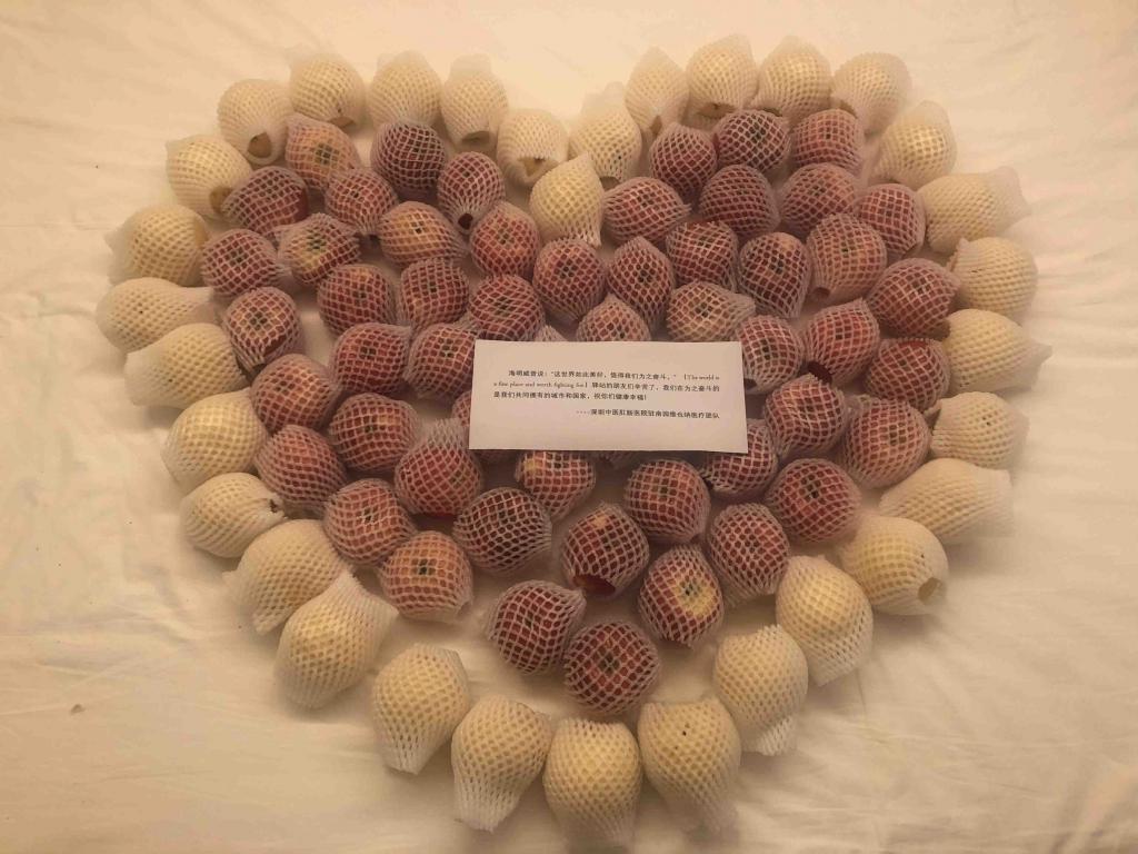 ▲深圳中醫(yī)肛腸醫(yī)院醫(yī)療團(tuán)隊(duì)為健康驛站醫(yī)學(xué)觀察人員贈(zèng)送的愛(ài)心水果。受訪者供圖