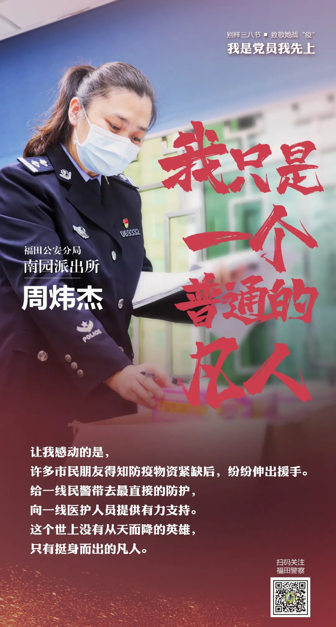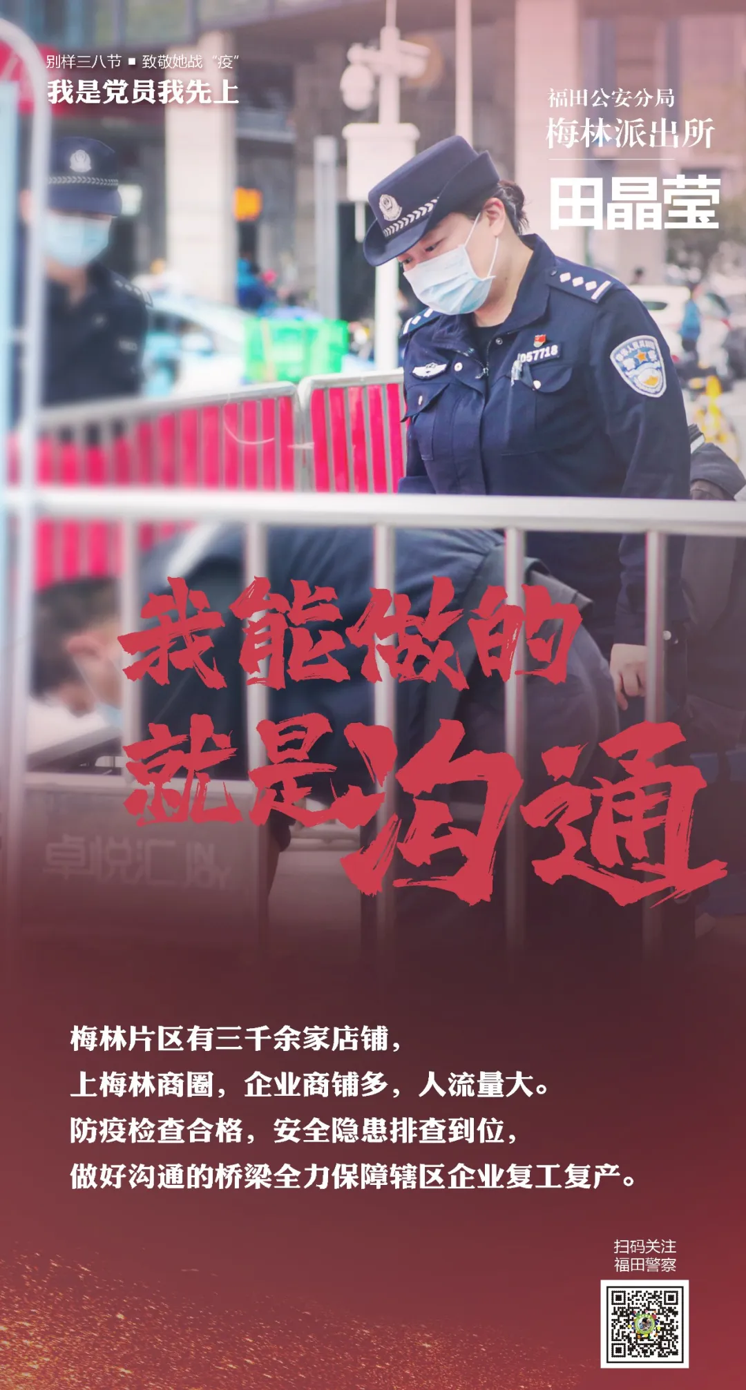 在“三八”國際勞動(dòng)?jì)D女節(jié)來臨之際,讓我們走進(jìn)福田警營,聽聽這些“最美逆行者”的戰(zhàn)疫故事。