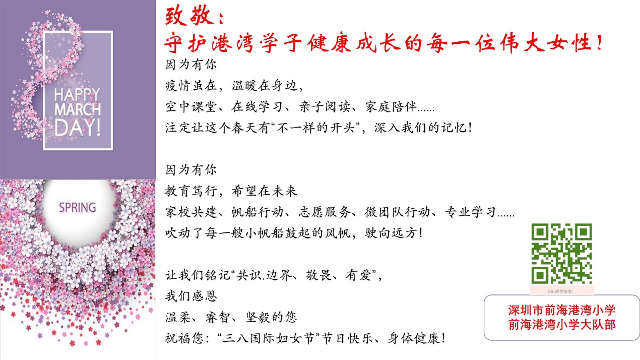 前海港灣小學(xué)希望這份特殊的“女神禮物”,讓我們在今年這個不一樣的“三八國際婦女節(jié)”的日子里感到不會一樣的溫暖。