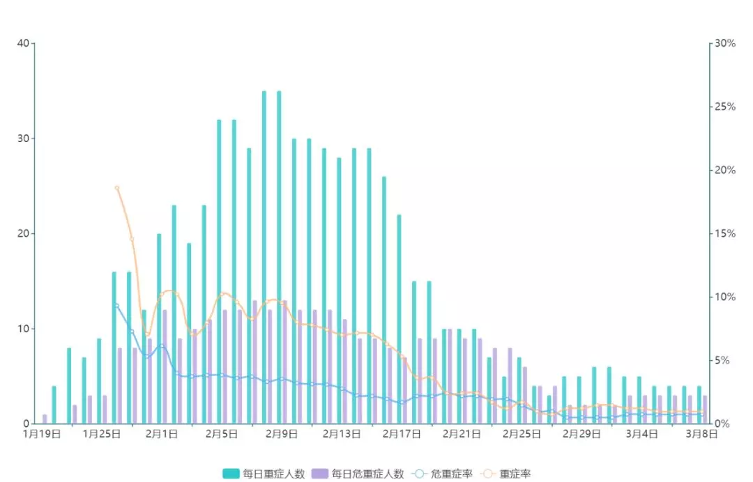 ▲深圳的危、重癥人數(shù)控制在較低水平,危重癥率維持在10%以下,病例以輕癥為主,多數(shù)患者的病情在早期便得到了有效遏制。