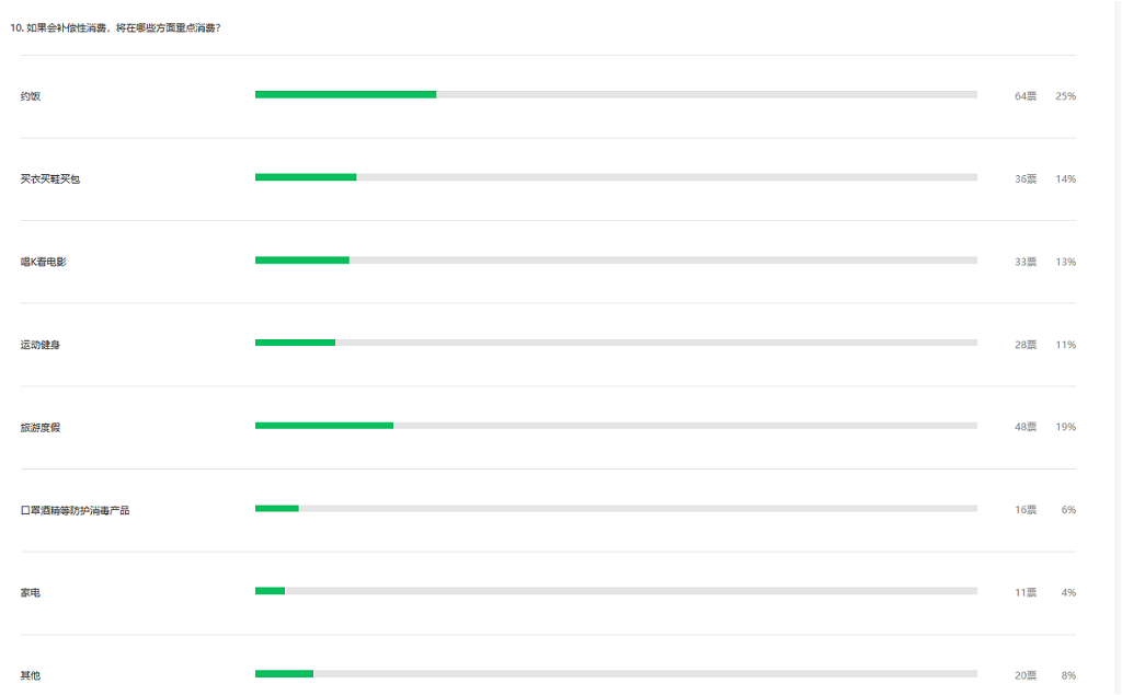 整體看,疫情對(duì)深圳市民總體消費(fèi)意愿有影響。調(diào)查顯示,近四成受訪者表示疫情結(jié)束后會(huì)有補(bǔ)償性消費(fèi),約飯、旅游度假、買衣買鞋買包、唱K看電影以及運(yùn)動(dòng)健身成為疫情過后補(bǔ)償性消費(fèi)的五大主要領(lǐng)域。