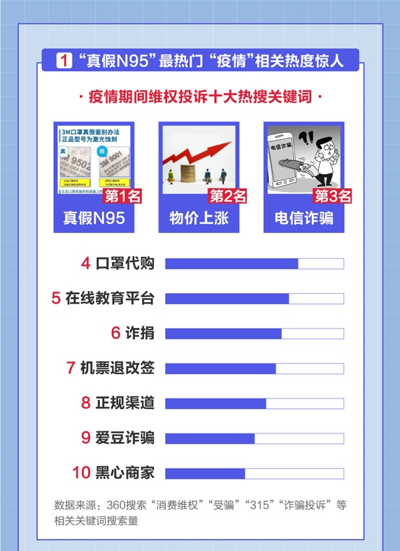 深圳商報(bào)2020年3月15日訊 360搜索、360瀏覽器今日發(fā)布《315消費(fèi)者維權(quán)數(shù)據(jù)報(bào)告》(以下簡(jiǎn)稱(chēng)《報(bào)告》)。報(bào)告顯示,“真假N95”、“口罩代購(gòu)”等與口罩質(zhì)量相關(guān)的訊息成熱議話(huà)題。