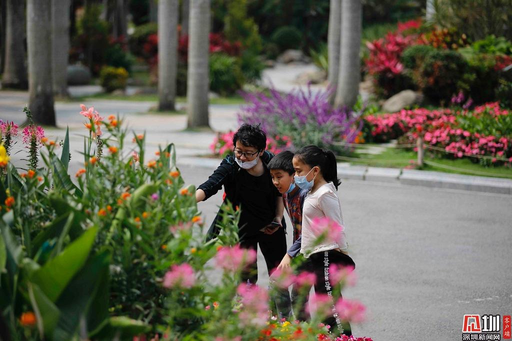 一位家長(zhǎng)帶著孩子們觀賞鮮花。