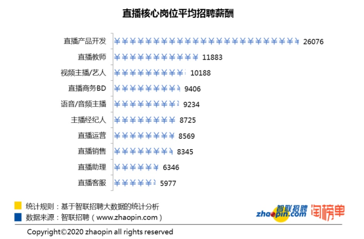 報(bào)告稱,直播崗位招聘需求快速上漲,而受疫情影響,求職者投遞行為滯后,因此目前直播工作競爭熱度已由2019年同期的32.8降至14.2,競爭程度大幅回落,市場呈現(xiàn)出明顯的人才主導(dǎo)局面。體現(xiàn)在薪酬方面,今年春節(jié)后一個月內(nèi),直播相關(guān)崗位的平均招聘薪酬為9845元/月,高于全行業(yè)平均水平,較去年同期上漲了1.63%。