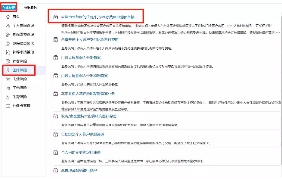 點(diǎn)擊“在線辦理”→點(diǎn)擊“醫(yī)療保險(xiǎn)”→點(diǎn)擊“申請(qǐng)市外就醫(yī)的住院/門診費(fèi)用報(bào)銷預(yù)審核”