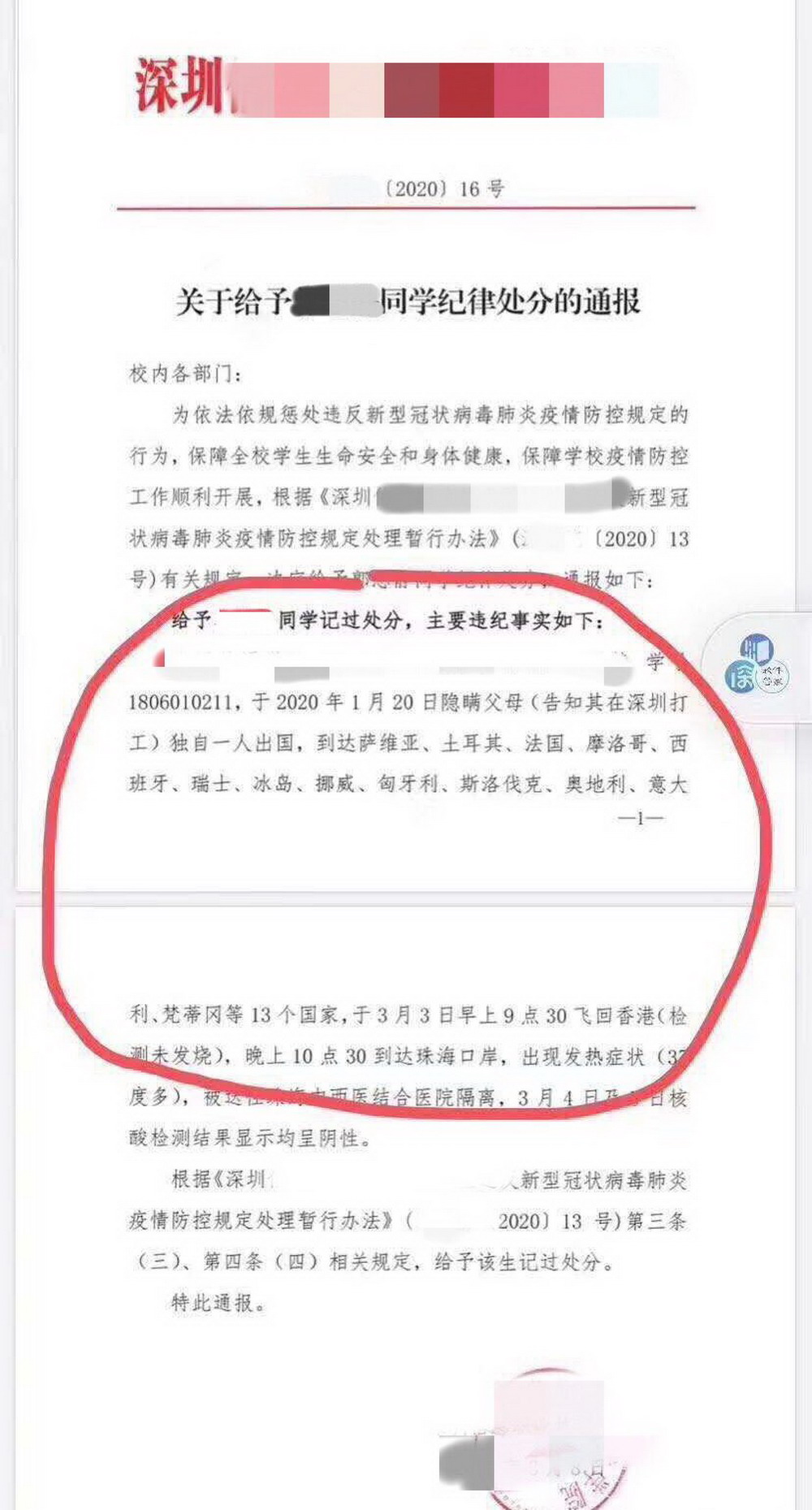 3月3日,小Y從珠海入境回國,在過海關(guān)時(shí)出現(xiàn)發(fā)燒癥狀并送往珠海中西醫(yī)結(jié)合醫(yī)院進(jìn)行隔離檢測。“在過關(guān)的時(shí)候需要填寫旅行史,我如實(shí)填寫了,因?yàn)樵?jīng)到過意大利等國家所以海關(guān)會重點(diǎn)監(jiān)測我。因?yàn)樽陨砻庖吡Φ?,以及倒時(shí)差的原因,有些感冒低燒,但我也沒有隱瞞什么,如實(shí)闡述了我的行程和身體狀況,也很配合海關(guān)人員的調(diào)查?!?月4日、5日,當(dāng)事人核酸檢測結(jié)果均為陰性,由于違反定瞞報(bào)行程,小Y被學(xué)校予以記過處分。對于學(xué)校的處分決定,她坦言接受?!拔覜]有如實(shí)向?qū)W校匯報(bào)我的行程,我接受學(xué)校對我的處分?!?/p>
