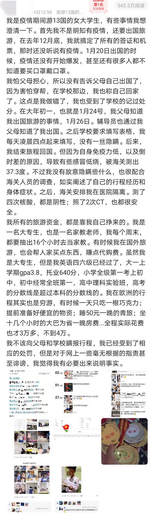 見圳客戶端·深圳新聞網(wǎng)2020年3月20日訊 近日,一位深圳女大學(xué)生小Y瞞著父母出游13國,回國后因發(fā)熱被隔離并因未如實(shí)向?qū)W校匯報(bào)行程被處分,此事引發(fā)社會關(guān)注。3月18日,當(dāng)事人接受深圳新聞網(wǎng)記者采訪,詳述事件經(jīng)過并表達(dá)悔意。