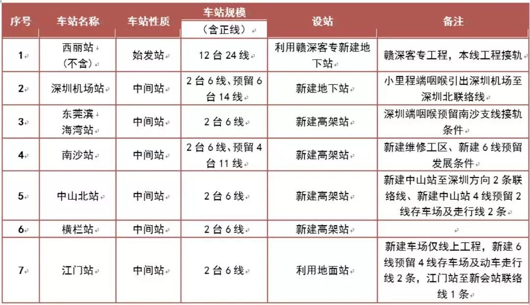 西麗至南沙段200km全線設(shè)西麗、深圳機場、東莞濱海灣、南沙、中山北、橫欄、江門等7座車站。