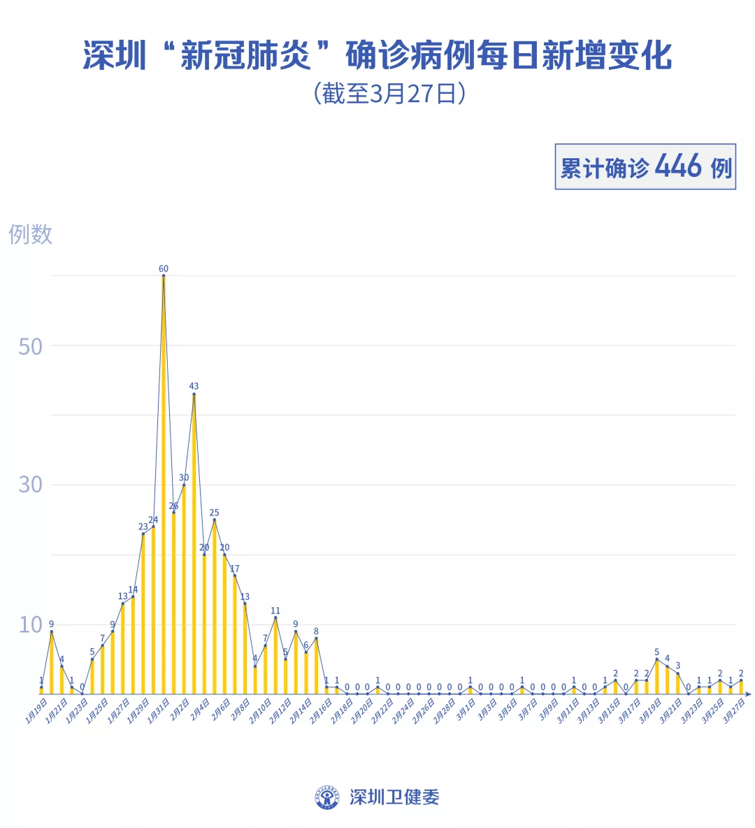 截至3月27日24時,深圳累計報告“新冠肺炎”病例446例。3月27日當天新增2例。