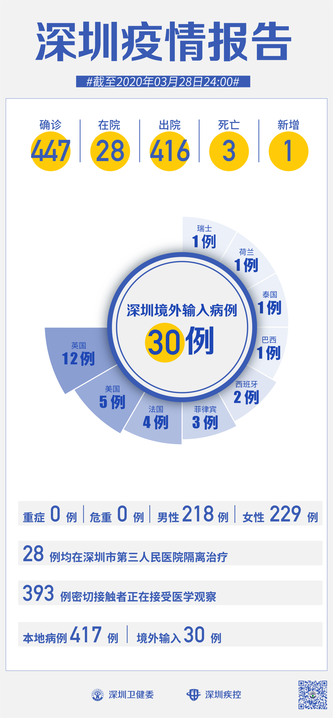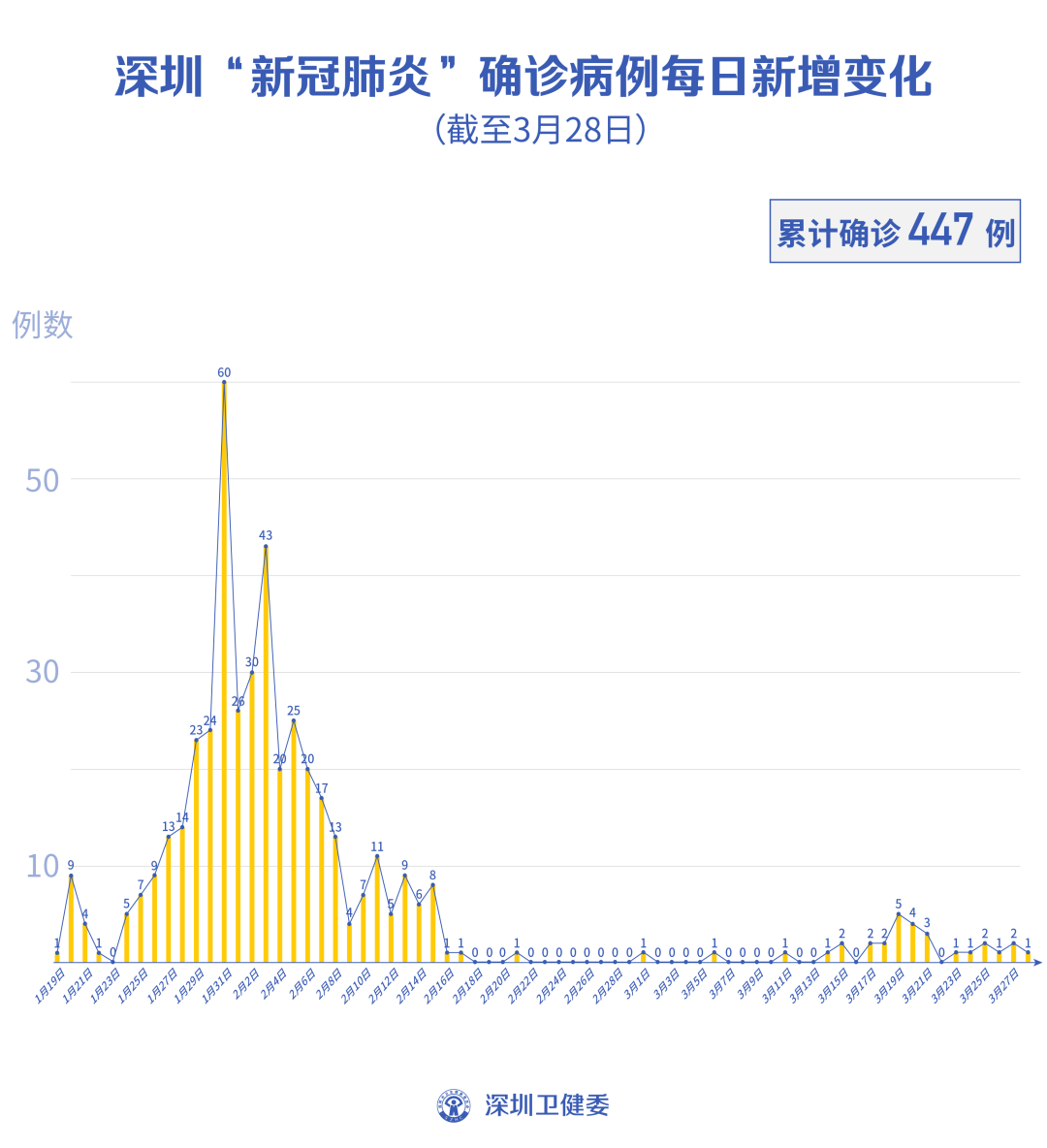 截至3月28日24時,深圳累計報告“新冠肺炎”病例447例。3月28日當(dāng)天新增1例。