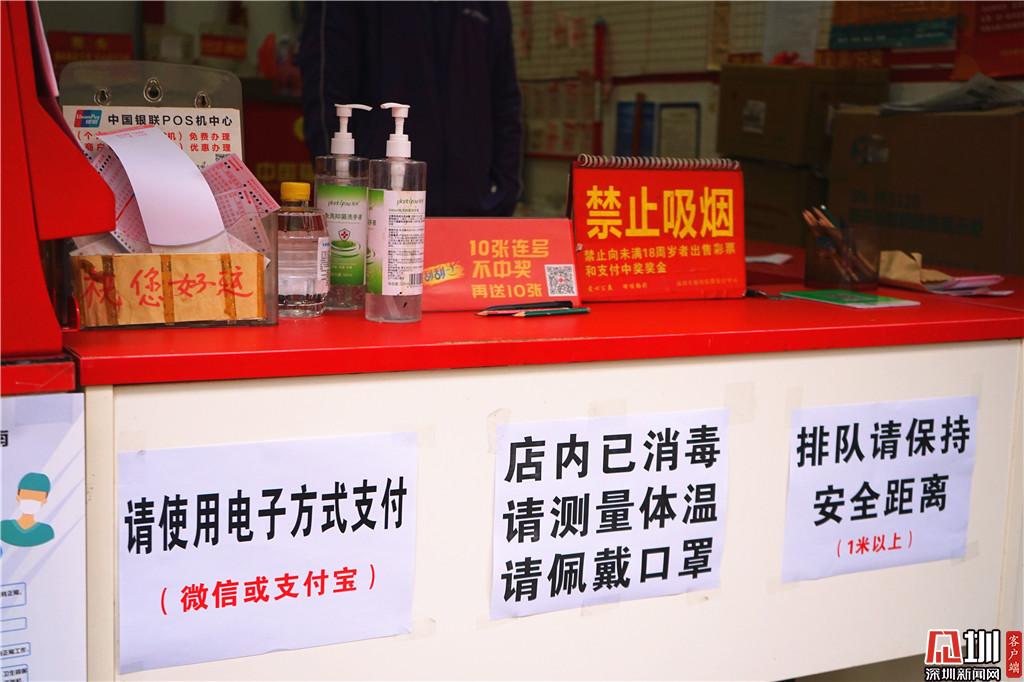 另一家在福田區(qū)華發(fā)北路,店號為83021044的投注站點,門口已經(jīng)被店員用桌子堵上,并貼上了相關(guān)防疫告示,“之前深圳福彩中心的工作人員來檢查過,后續(xù)也會給我們配送一些防護物資?!庇浾咴诖擞^察了30分鐘,期間僅有兩位彩民前來,共購買了8元彩票。店主馬先生向記者介紹,“以前大家都會來店里邊坐,主要買的是20分鐘開兩次的‘快樂彩’,現(xiàn)在都不給進來,那個彩票也暫停銷售了。”