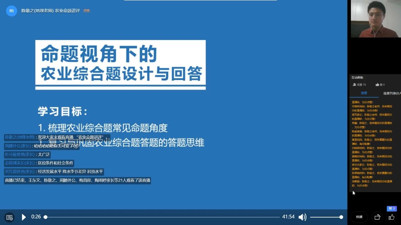 地理科李金鳳老師在《農業(yè)區(qū)位因素及其變化》一課中組織了線上分組討論,并對小組討論的結果逐一點評,及時反饋。