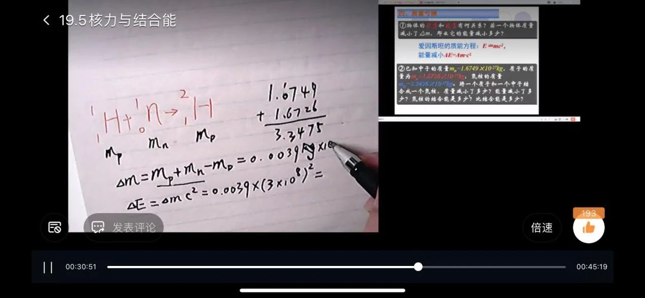 物理科何揚峰老師在執(zhí)教《核力與結合能》一課時靈活運用手寫板、電腦和手機等多種工具,讓學生能夠同時看到PPT和教師板書畫面,完美地還原了在校學習情境。