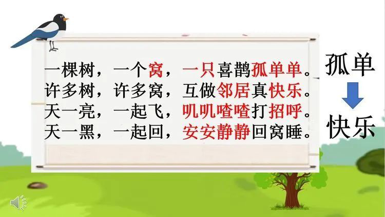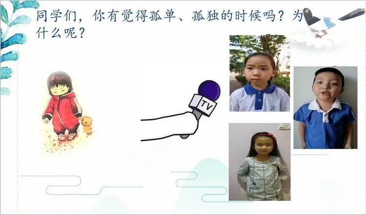 在劉老師的課堂上,她帶來(lái)《樹(shù)和喜鵲》故事中主人公小喜鵲日記本獎(jiǎng)勵(lì)讀書(shū)流利、情感充沛的孩子們。通過(guò)小喜鵲的日記,婉儀老師將課堂成功地轉(zhuǎn)接到課文的文本當(dāng)中。進(jìn)而有對(duì)文章中出現(xiàn)的事物、事物所具備的特點(diǎn)展開(kāi)了細(xì)致而有趣的學(xué)習(xí)。期間,婉儀老師還化身小記者,用三段對(duì)于自己學(xué)生的采訪視頻,讓學(xué)生對(duì)于“孤單”二字有了更加深刻的理解。