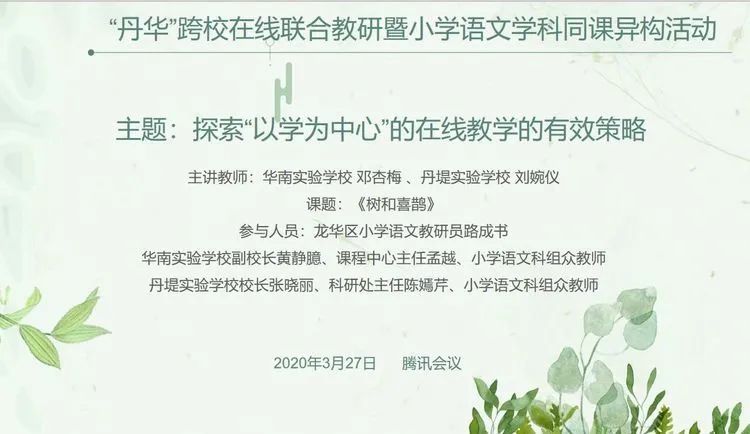 見(jiàn)圳客戶(hù)端、深圳新聞網(wǎng)2020年3月31日訊 (記者 潘寶儀)丹堤實(shí)驗(yàn)學(xué)校與華南實(shí)驗(yàn)學(xué)校異苔同岑,相聚“丹華”,以鄧杏梅老師與劉婉儀老師關(guān)于《樹(shù)和喜鵲》的同課異構(gòu)為課例,開(kāi)展了丹華跨校“以學(xué)為中心”的小學(xué)語(yǔ)文在線教學(xué)策略研討會(huì)。