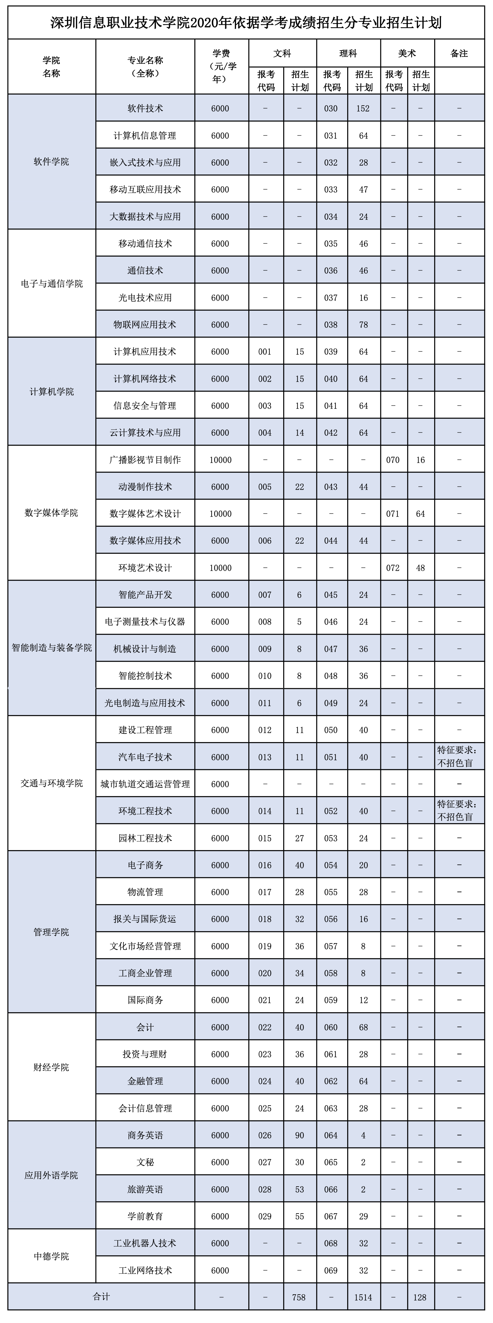 “依學考成績錄取”是深圳信息學院2020年春季高考招生重要形式之一,今年學校計劃招生2400人,面向文科計劃招生758人,理科計劃招生1514人,美術計劃招生128人。該校軟件學院、電子與通信學院、計算機學院、數字媒體學院、智能制造與裝備學院、交通與環(huán)境學院、管理學院、財經學院、應用外語學院、中德學院等10個學院均有招生計劃,招生專業(yè)共43個。