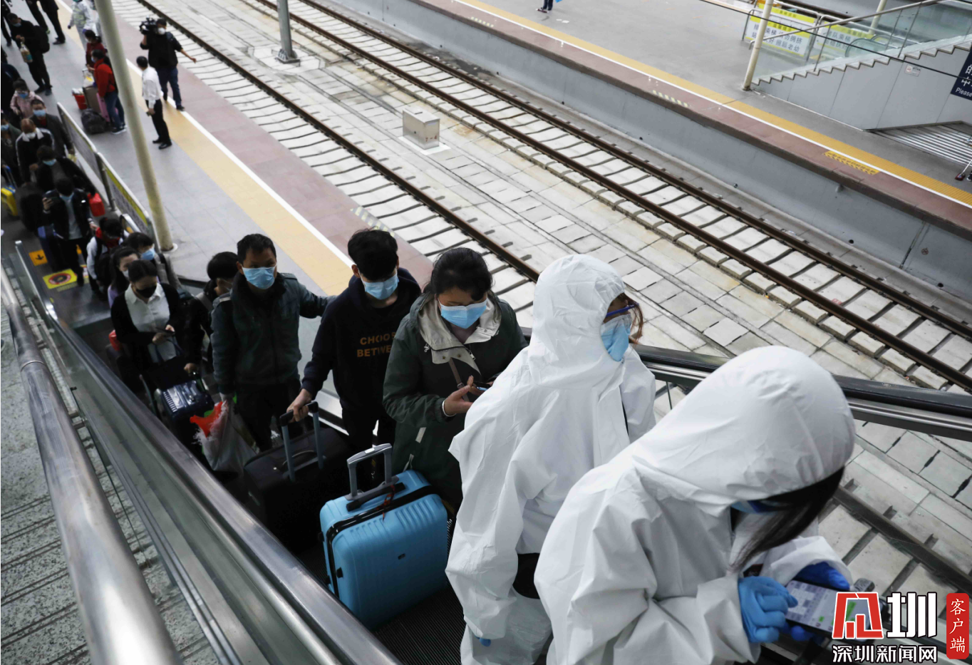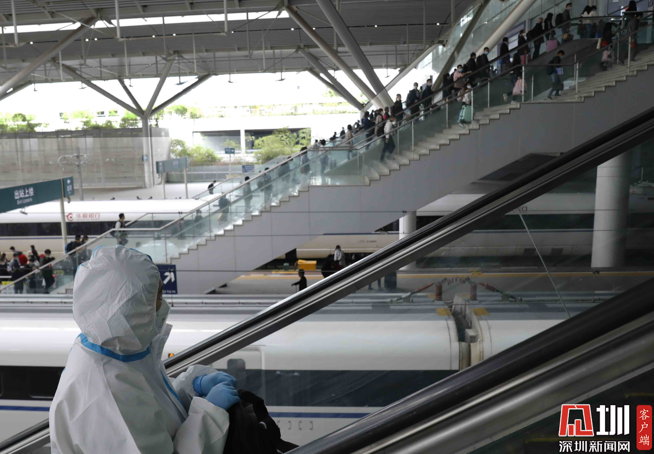 深圳北站西廣場(chǎng)出站口,三位“全副武裝”的旅客。