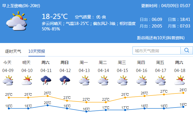 9-10日多云間晴天,氣溫回升;11日午后轉(zhuǎn)雷雨天氣,并伴有短時大風;12-13日冷空氣影響,氣溫下降3-4℃;展望14-16日多云天氣為主,氣溫逐日回升。