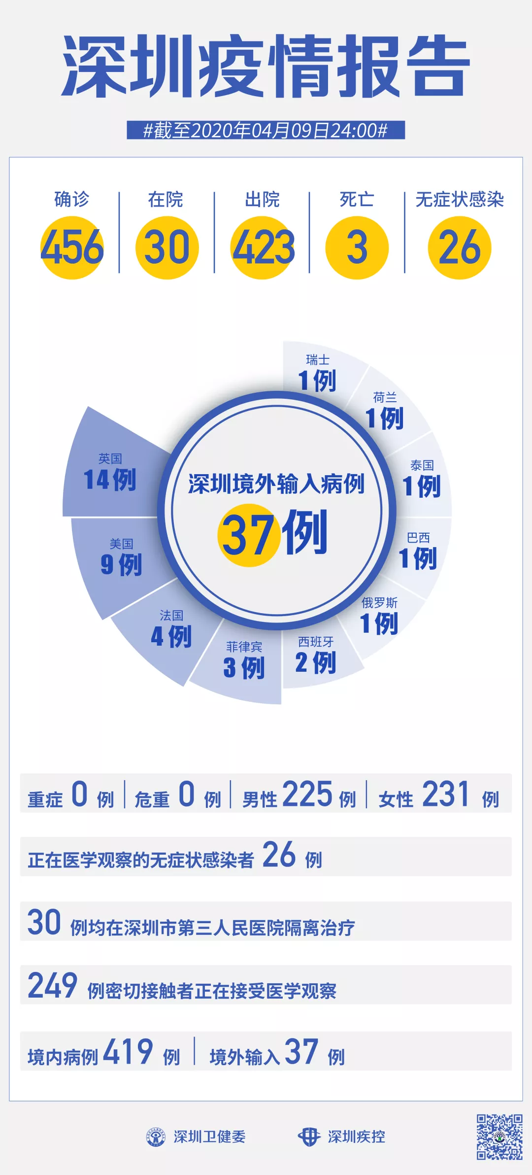 截至4月9日24時(shí),深圳累計(jì)報(bào)告新冠肺炎病例456例。4月9日當(dāng)天新增出院1例。