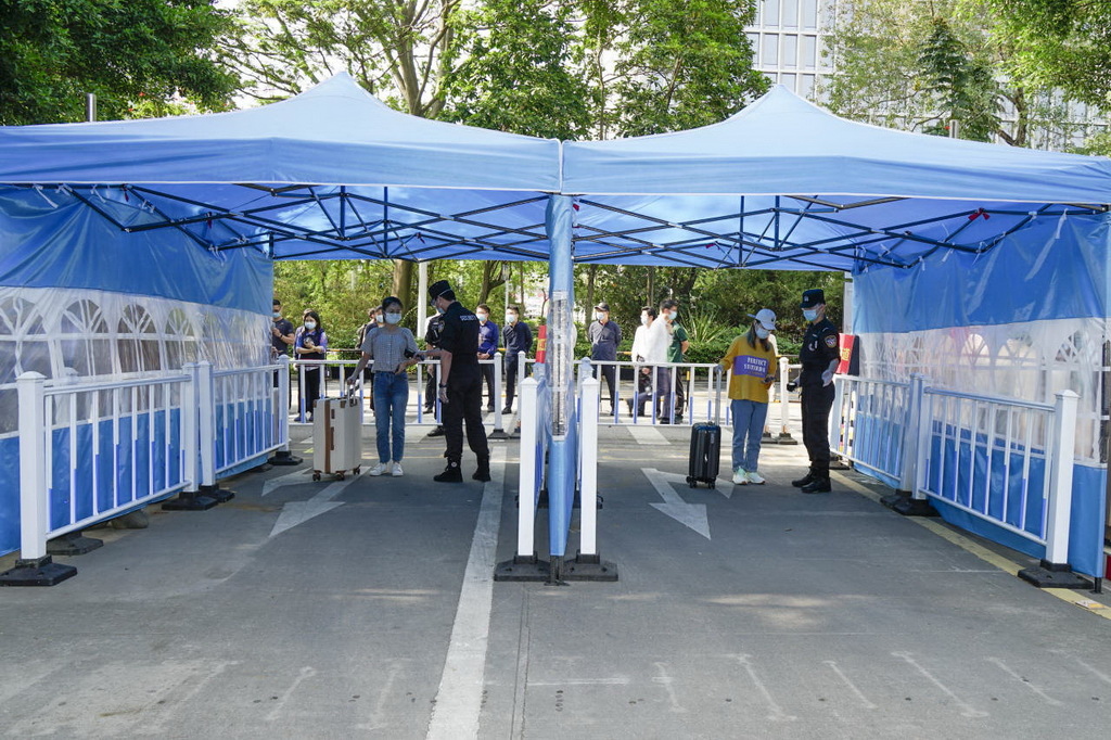 帶行李箱的學(xué)生走專用通道,依次完成掃碼核驗(yàn)、測量體溫等流程后進(jìn)入校園。