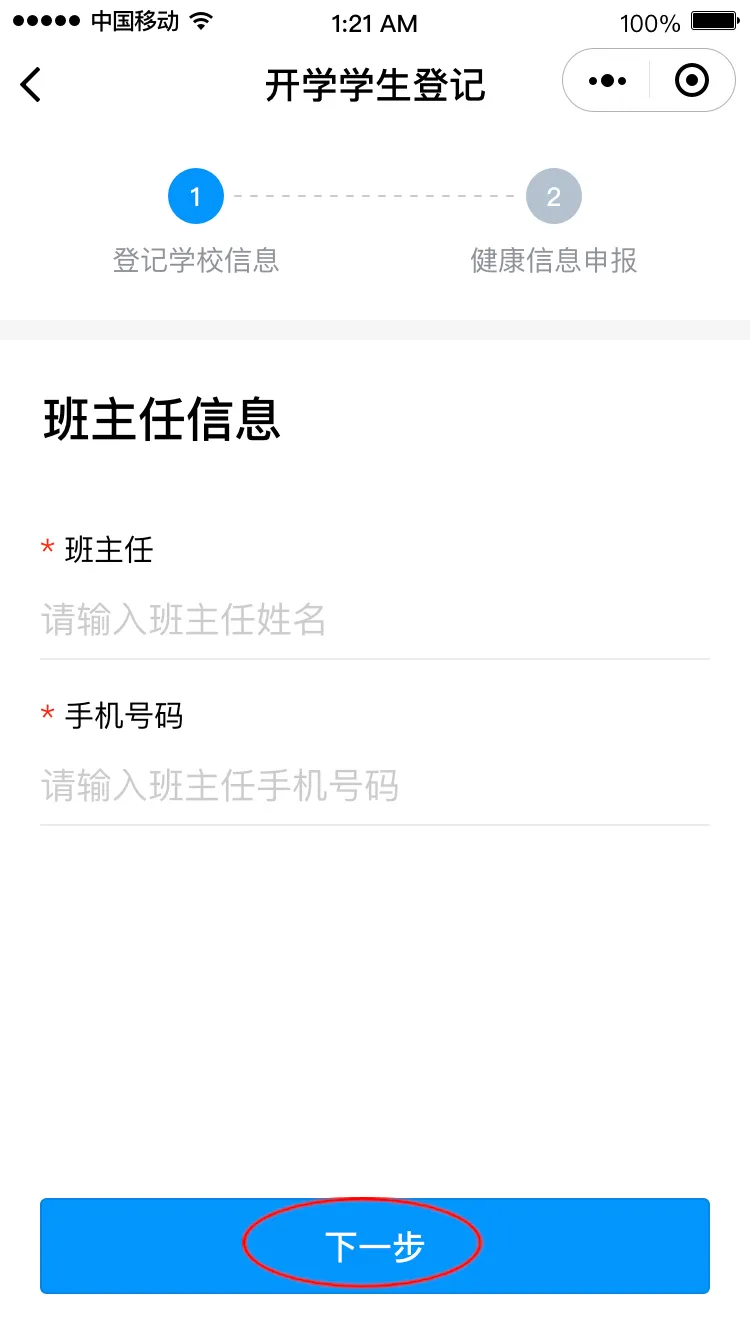 進(jìn)入“開學(xué)學(xué)生登記”頁面,點(diǎn)擊“馬上登記”進(jìn)入登記界面,填寫班主任姓名和手機(jī)號(hào)碼后點(diǎn)擊“下一步”,請(qǐng)選擇對(duì)應(yīng)的班級(jí),進(jìn)入健康申報(bào)卡界面。